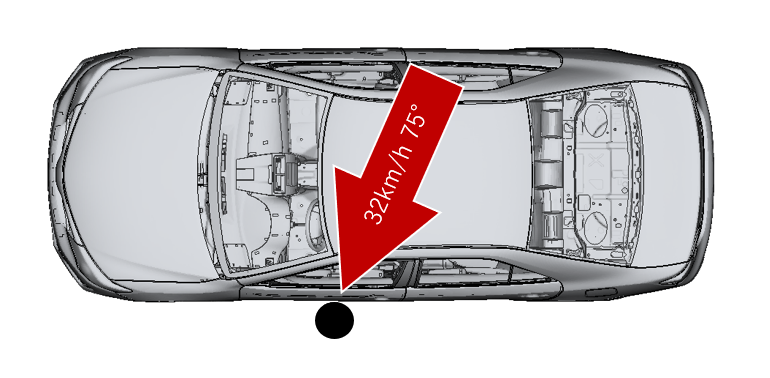 32km/hの速度で75°の角度をつけてφ254剛体ポールに衝突する。主に乗員傷害値を確認するが、EVではバッテリーへの危害性のために車体変形量の抑制が求められる。